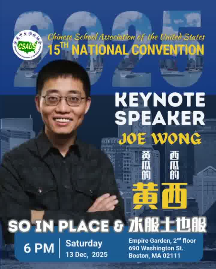 欢迎参加由全美中文学校协会(CSAUS)举办的第十五届全美中文学校协会年会暨中华教育研讨会。本次会议将于2025年12月12日至14日在马萨诸塞州波士顿举行。